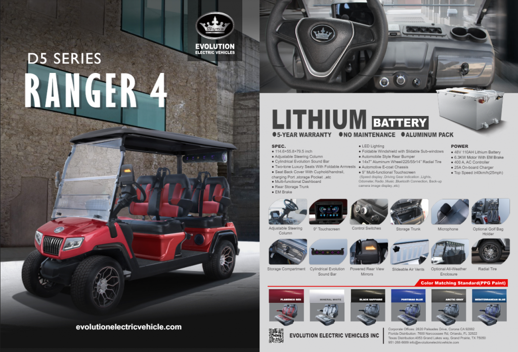 Luxury doesn’t stop at the aesthetic; it permeates the very experience of the D5 Ranger 4. The adjustable steering column and top-notch seats ensure that every drive is a symphony of comfort. Sliding air vents ensure you’re cocooned in comfort, allowing the breeze to glide through without a hair out of place. Even the tires, with their precise design, ensure that the ride is smooth and turf-friendly.